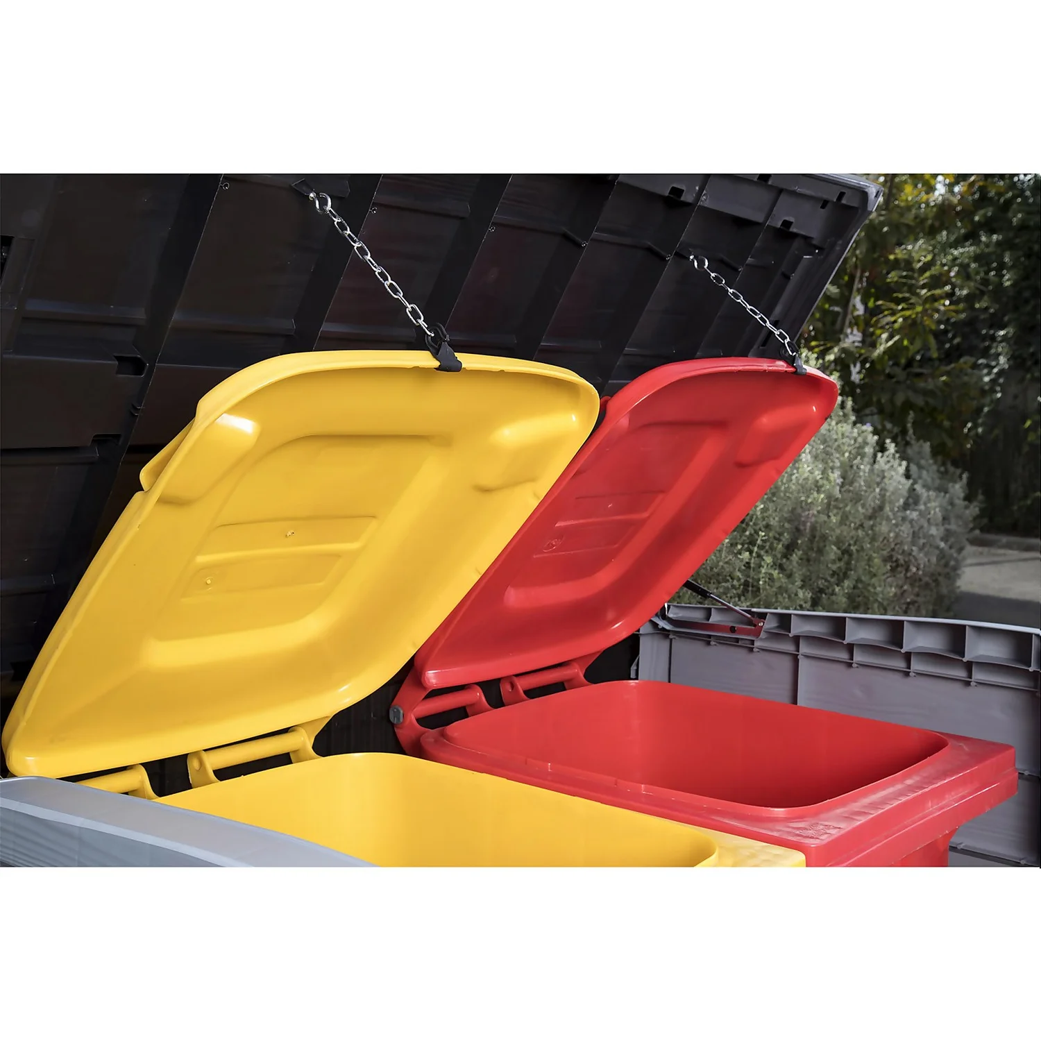 In order to make storage easy it opens from the top or from the front, has an easy-opening lid and a sloped threshold that makes rolling large items in or out simple. With the capacity to hold two 240 L/63 G wheelie bins.