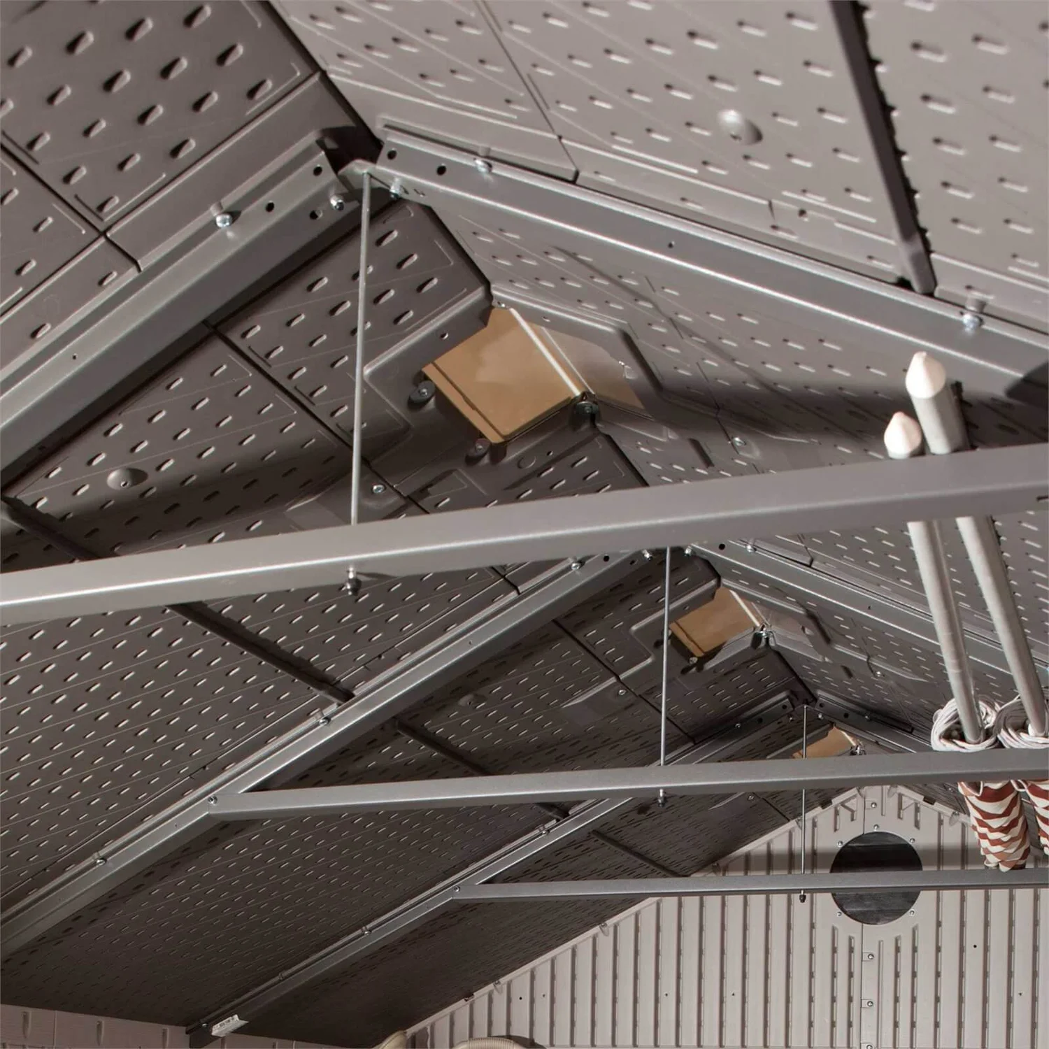 The Lifetime 8 ft. x 15 ft. Outdoor storage shed features: 5 small skylights, 2 shatter-proof windows, 2 screened vents, 1 90 x 9. shelf, 2 30 x 10. shelves, 2 corner shelves, and a 10-year limited warranty. Floor and installation hardware included. Arrives packaged in 3 boxes.
