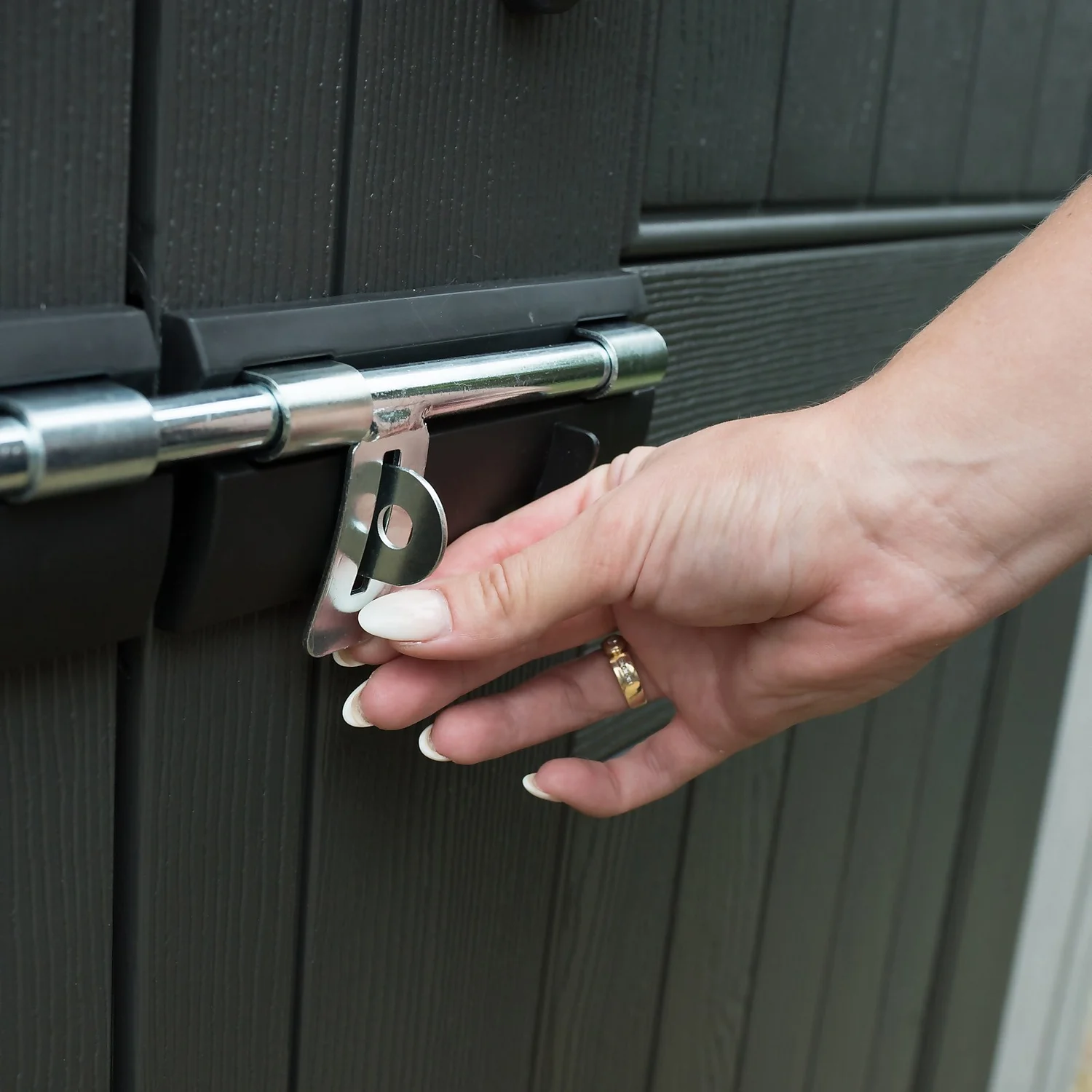 Lifetime’s 7-foot wide Outdoor Storage Sheds have several innovative features, including a skylight that runs the entire length of the roof to maximize natural lighting. They also include single-hinged double doors that open nearly 180 degrees and lock closed, a slip-resistant polyethylene floor, and low-maintenance, steel-reinforced construction.