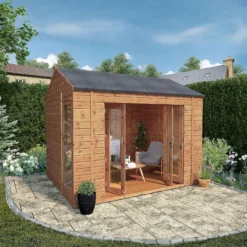 Our spacious and stylish 8 x 10ft Vermont summerhouse boasts a bright, open space, perfect for entertaining and relaxing. Featuring two fixed styrene glazed windows and two sets of bi-folding doors, this summerhouse is light and airy, great for those who want to enjoy their garden and the summer weather while being shaded from the sun.