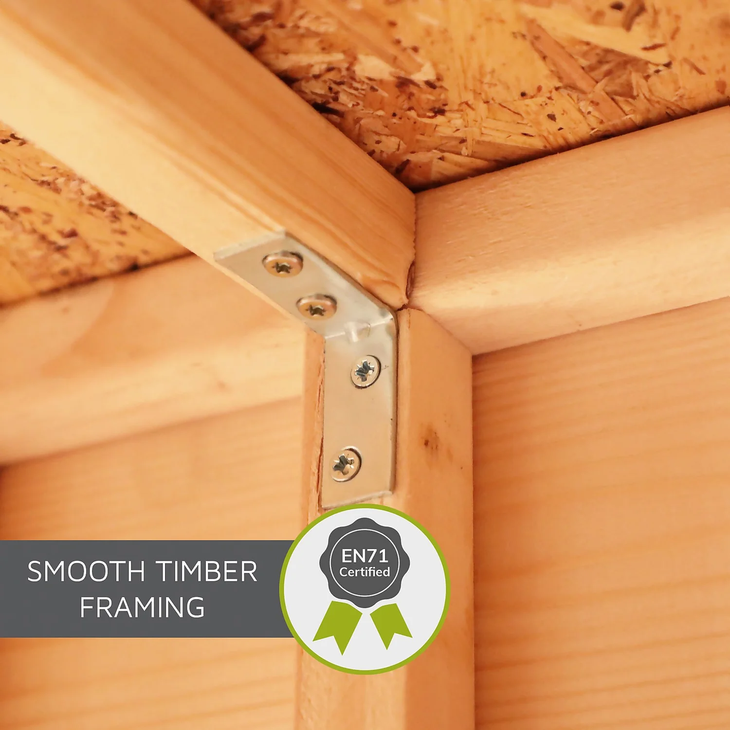 Create a unique space for your children to run wild with their imaginations and help encourage play outside with this 6ft x 5ft Sherriff Pent Wooden Playhouse. A quaint veranda creates a welcoming entrance to a world of pure imagination and inside offers a spacious interior for tea parties and plenty of games. Made in the UK from high-quality materials and made in accordance with Toys (Safety) Regulation 2011 (EN71), you can be rest assured that your children can play safely. The timber used to form this wooden playhouse has been planed and rounded for a smooth finish to reduce the risk of splinters as well as the two windows being glazed with 100% shatterproof styrene for added safety. There is also a small gap around the door to prevent little fingers from getting trapped