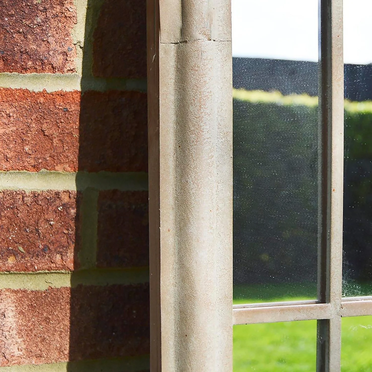 MirrorOutlet Sunflower large Gothic designed garden wall mirror. This mirror has an arched top and a classic Gothic look to it the frame itself has a rustic effect and is also frost protected to withstand all weathers. This item would add the finishing touch to your garden. This item is 4ft11, 150cm tall. Just screw/s in the wall and hook on keyway/s on the back.