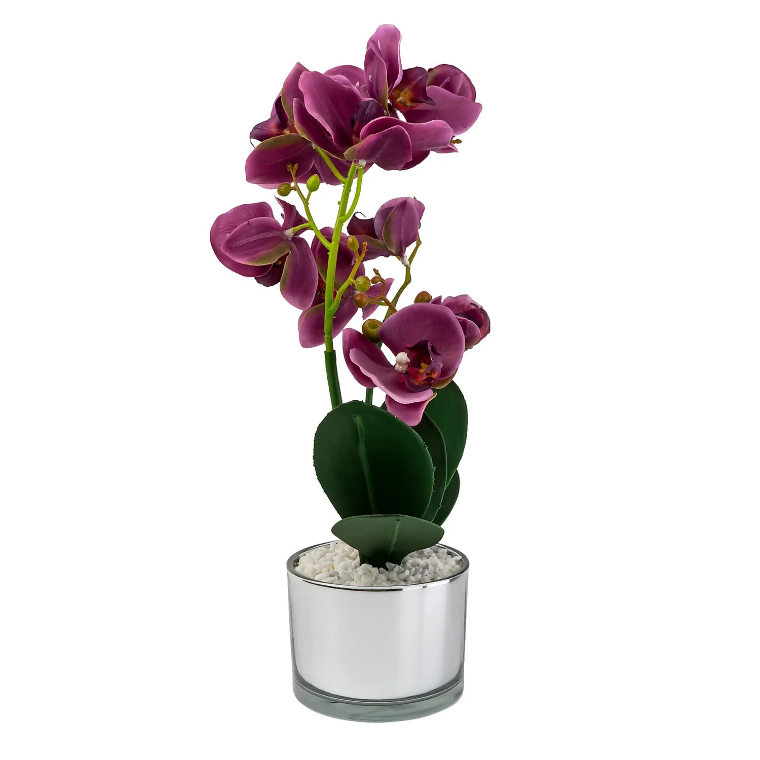This artificial purple orchid is complimented by a metallic silver pot